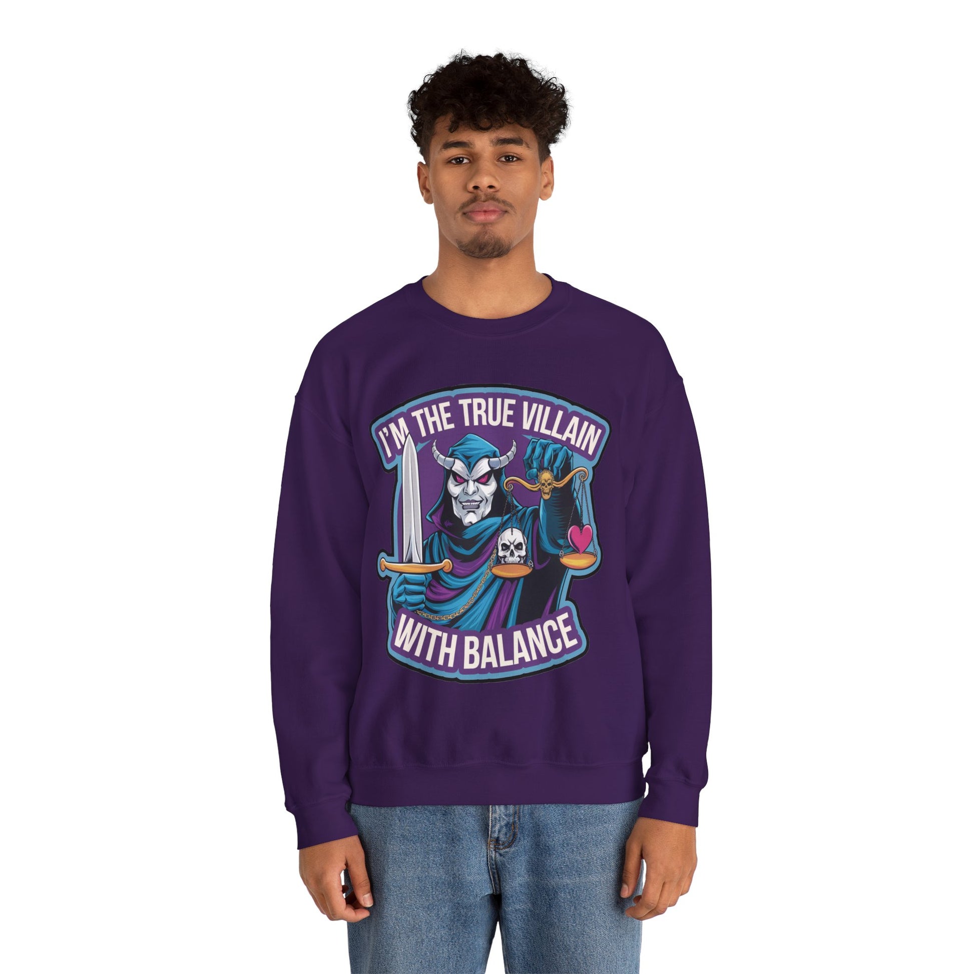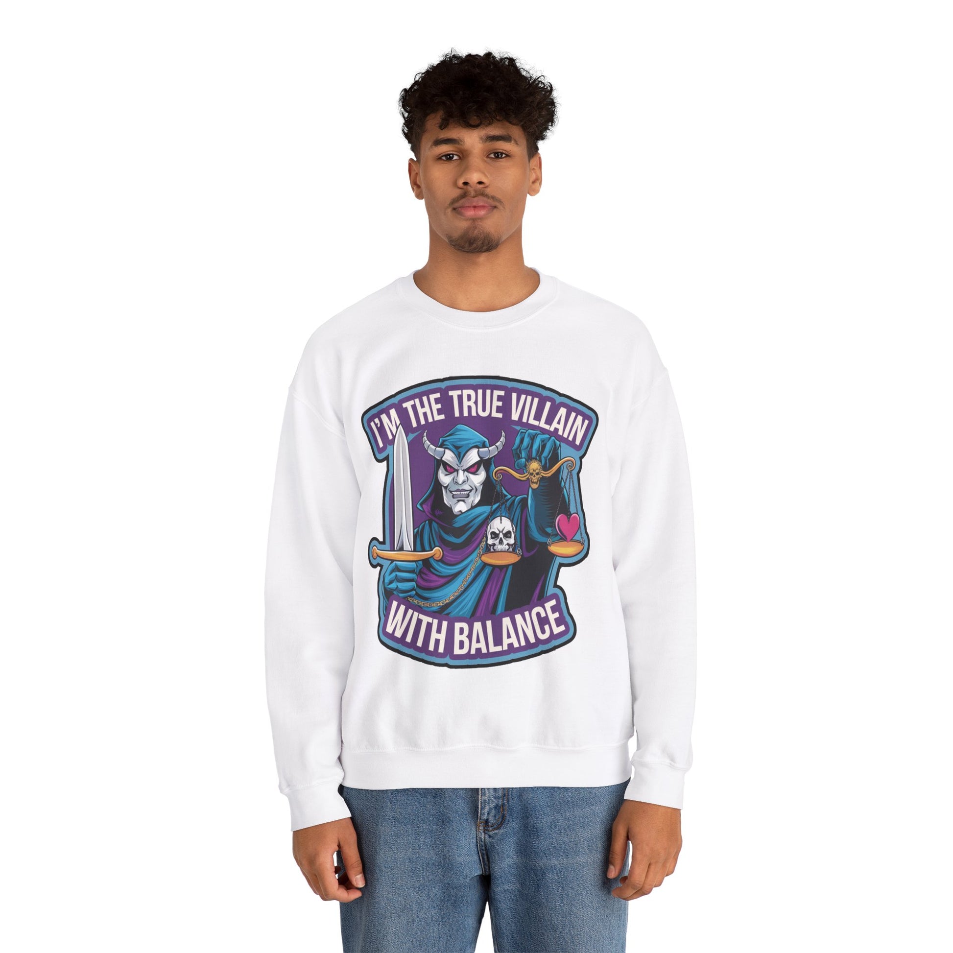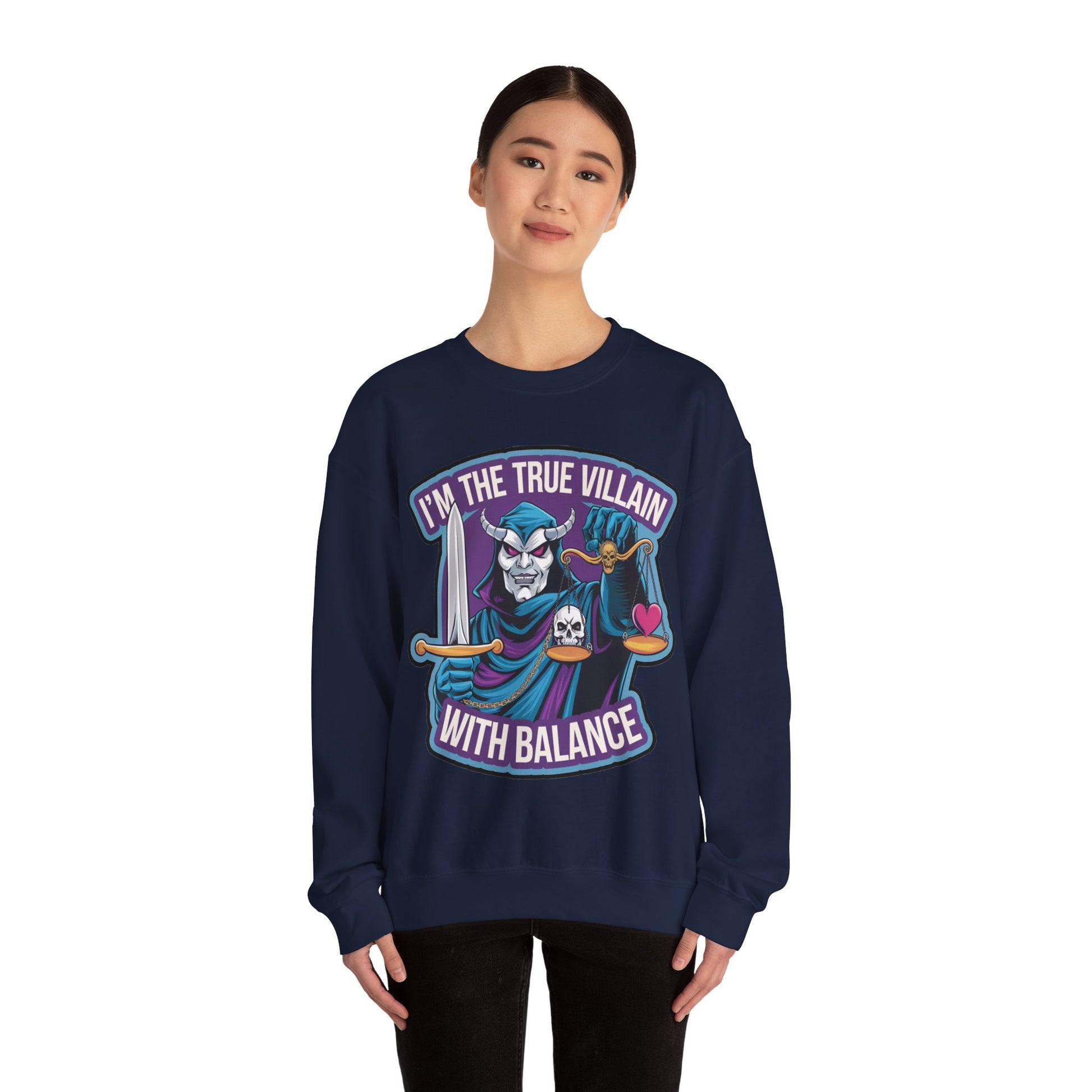 I'm the true villain with balance Crewneck Sweatshirt. It features an illustration of a masked villain with a sword holding a balance scale with a heart and a skull. text "I'm the true villain with Balance" shows you that besides