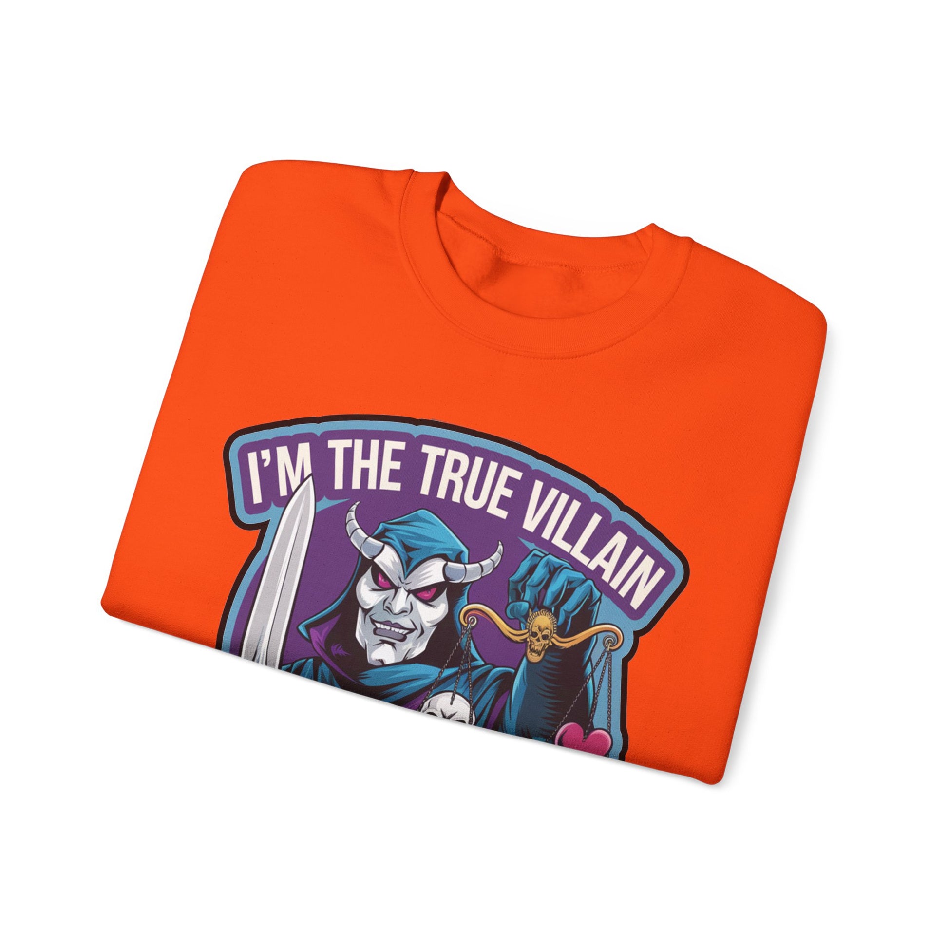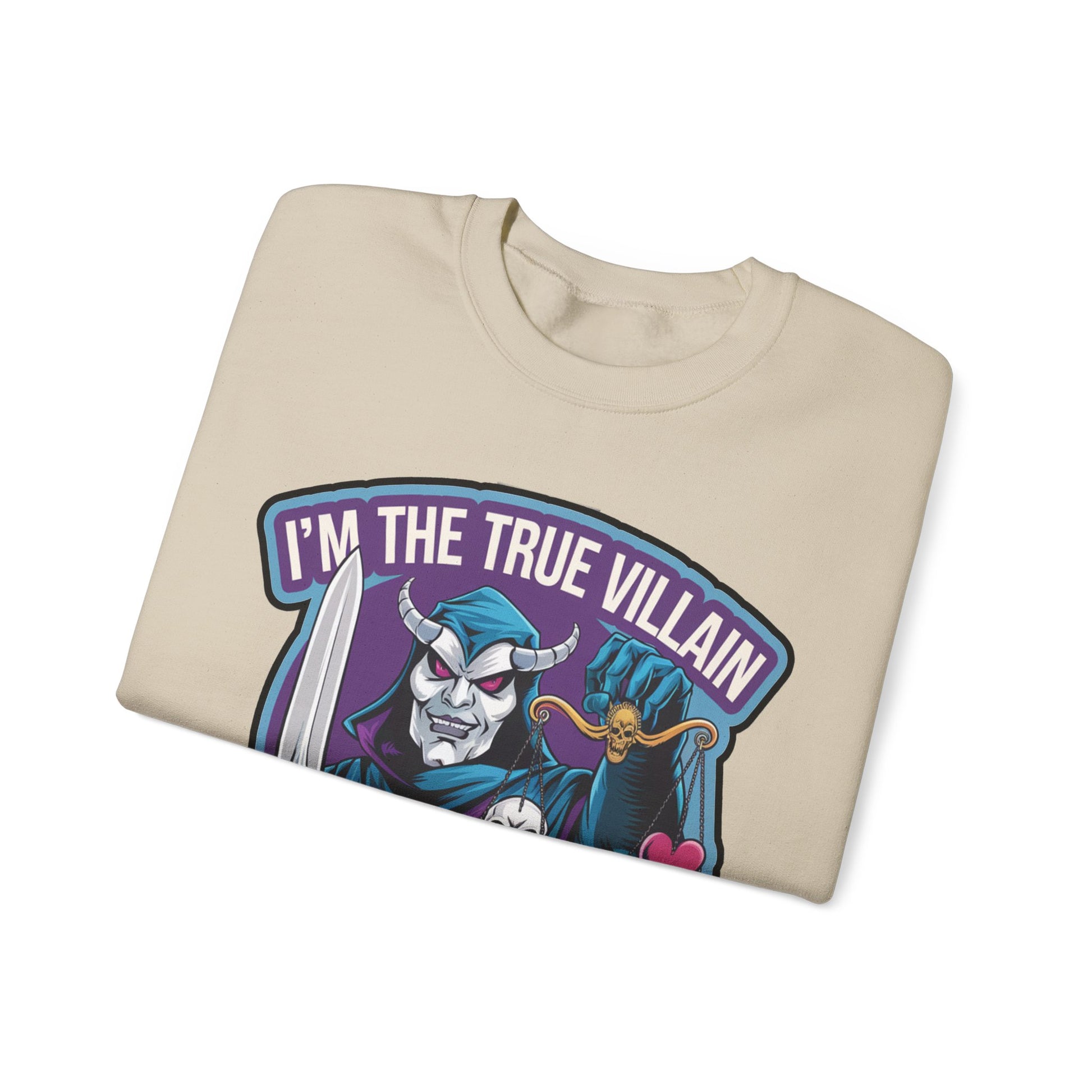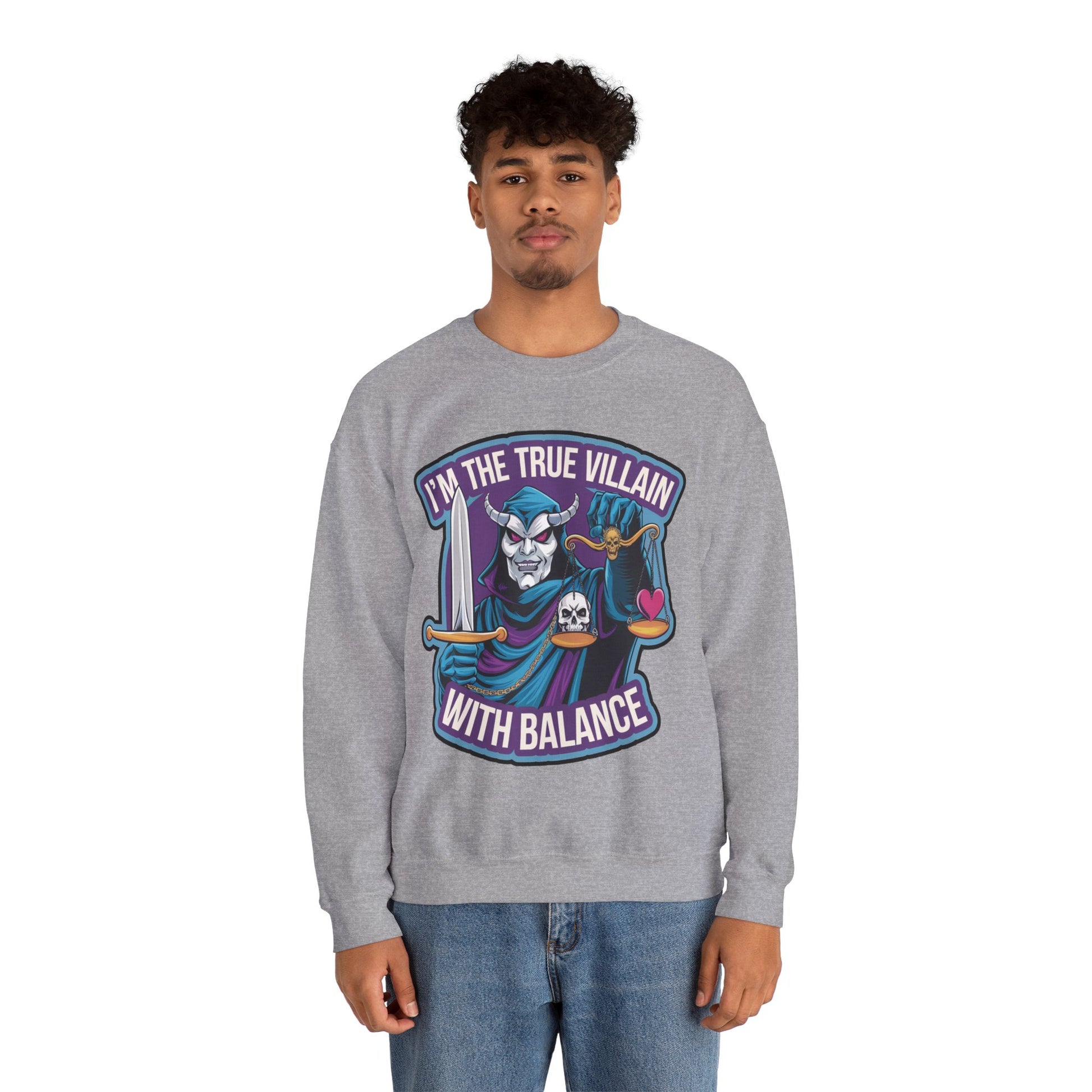 I'm the true villain with balance Crewneck Sweatshirt. It features an illustration of a masked villain with a sword holding a balance scale with a heart and a skull. text "I'm the true villain with Balance" shows you that besides